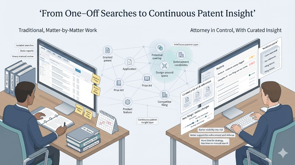 The goal isn’t to replace counsel. The goal is to turn IP work from “manual search and re-search” into “continuous, organized, defensible insight.”