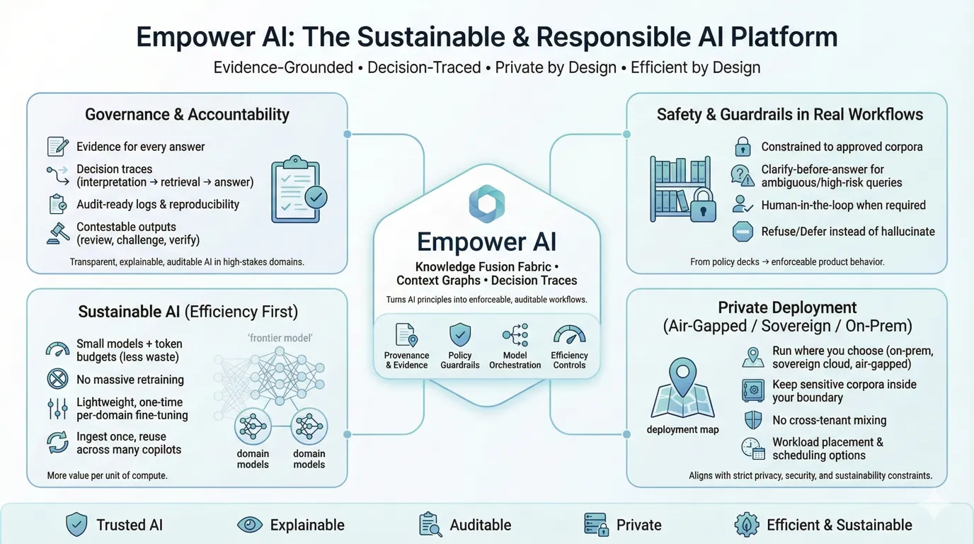 The Empower AI stack implements these constraints through its core infrastructure: decision traces capture every step of AI reasoning. Context graphs structure domain knowledge with full provenance. The Knowledge Fusion Fabric ensures that every AI output is grounded in verified, source-attributed information.