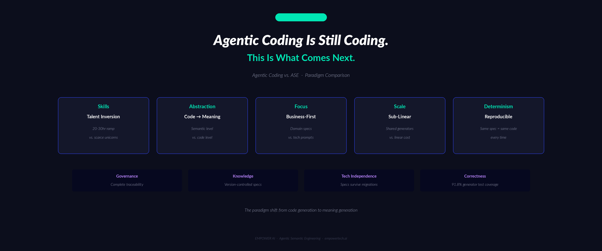 The shift from agentic coding to Agentic Semantic Engineering isn't about speed or savings. It's about operating at a fundamentally different level — where you specify meaning, and the code writes itself.