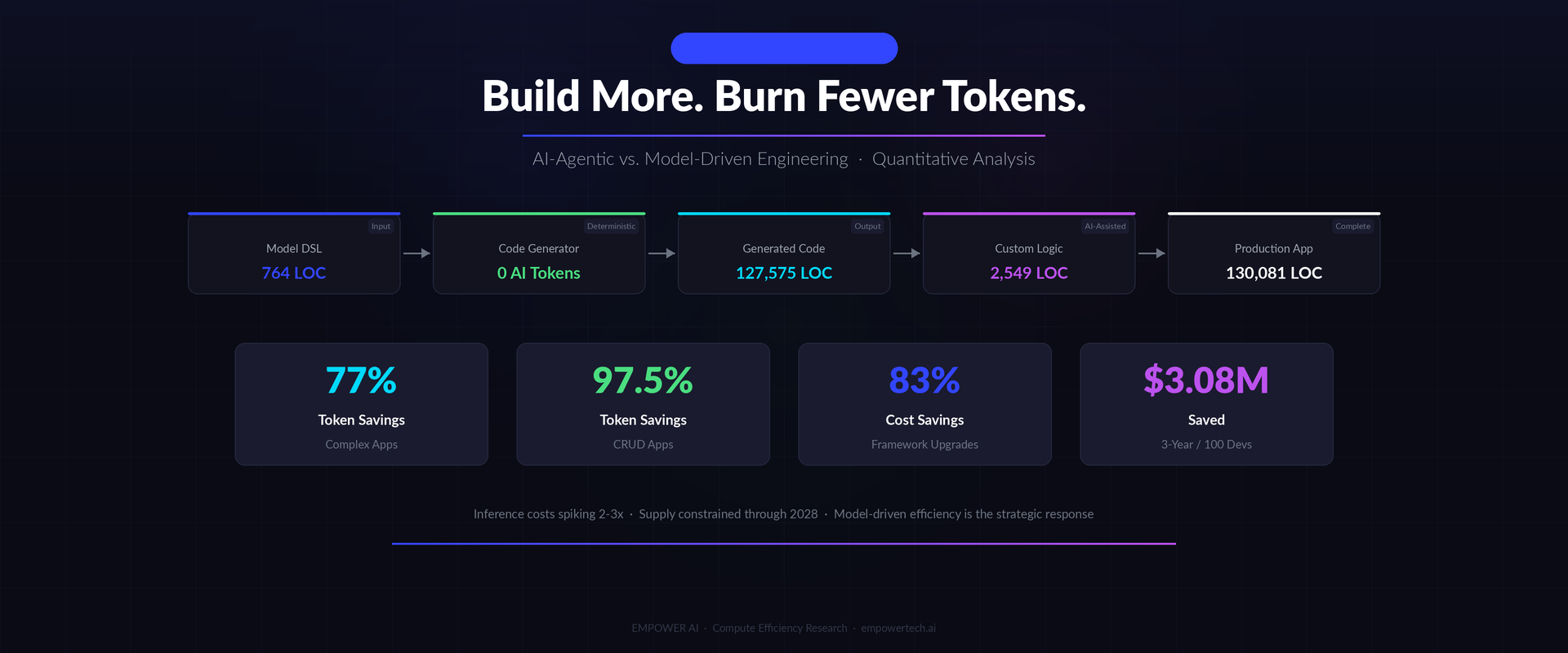 In this environment, pure agentic development becomes prohibitively expensive at scale. MDD is the strategic response — building enterprise software with 77-97% fewer AI tokens means enterprises can scale without being held hostage by inference costs.